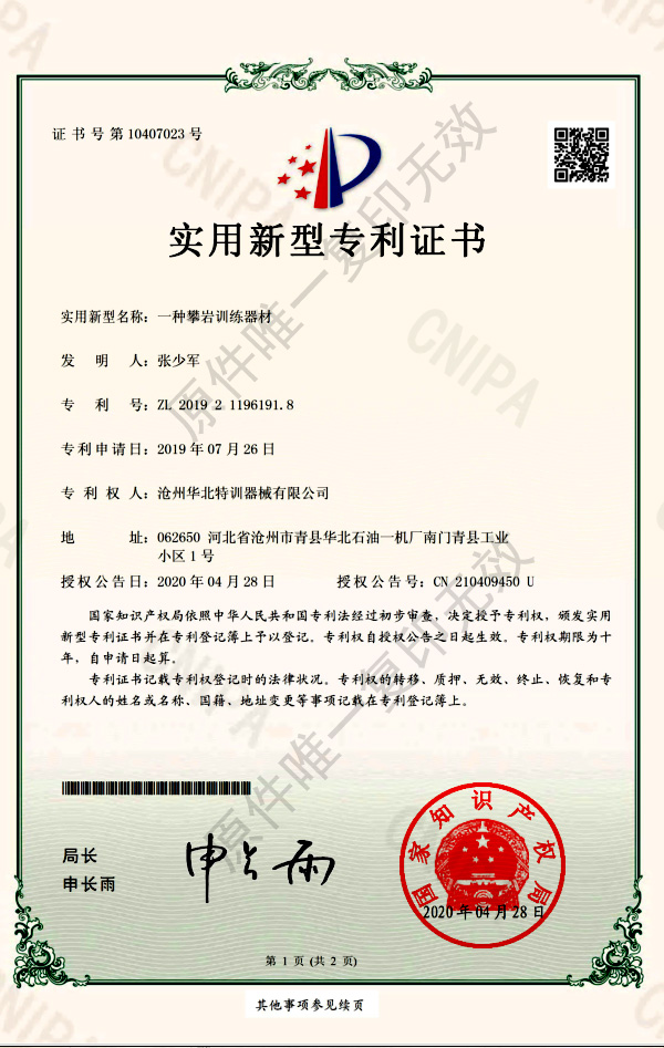 攀巖訓(xùn)練器材專利證書