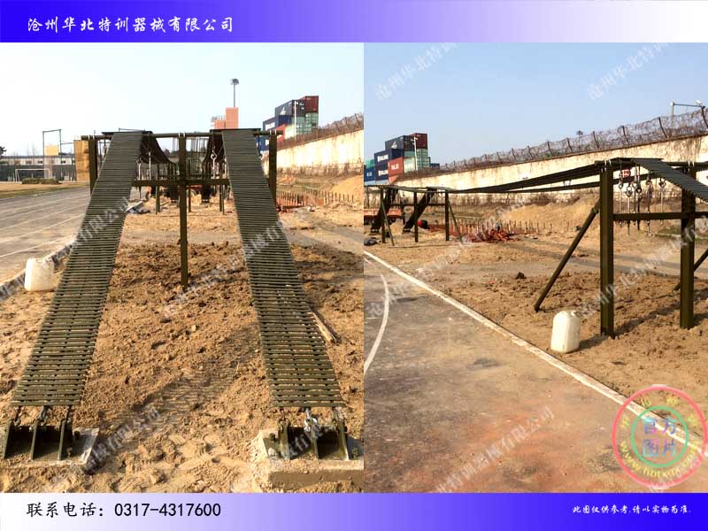 所述障礙物為依次排列的軟橋1、螺旋梯2、高低橫木3、繩網(wǎng)4、輪胎攀臺5、搖擺平臺6、晃動橫梯7、跨網(wǎng)8、阻絕墻9、模擬沙灘10。渡海登島400米障礙場針對渡海登陸作戰(zhàn)的實戰(zhàn)環(huán)境,以提高單兵海上作戰(zhàn)適應(yīng)能力為重點,遵循體能訓(xùn)練規(guī)律,按照系統(tǒng)組合的原理,不同程度地模擬裝載、航渡、換乘、搶灘上陸的特殊狀態(tài),集體能、技能和心理訓(xùn)練為一體,適應(yīng)渡海登陸作戰(zhàn)訓(xùn)練需要。
