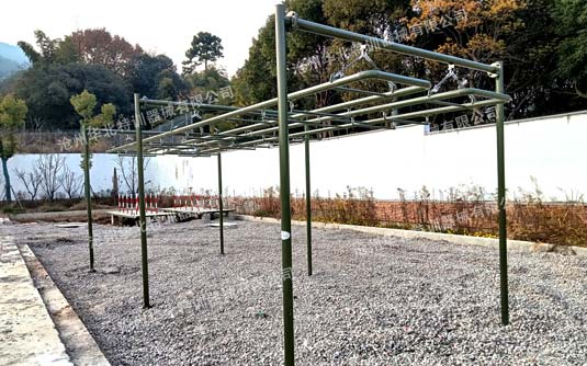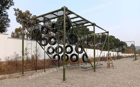 渡海登島400米障礙場為各國海軍日常訓練科目之一,場地采用4次回轉,共10個項目,依次為:軟橋、螺旋梯、高低橫木、繩網(wǎng)、輪胎攀臺、搖擺平臺、晃動橫梯、跨網(wǎng)、阻絕墻、模擬沙灘。跑道分四道,其中三道障礙道,每道寬6米,一道模擬沙灘,寬2米。場地總體尺寸100米×20米?捎寐费朗鲋吔纭