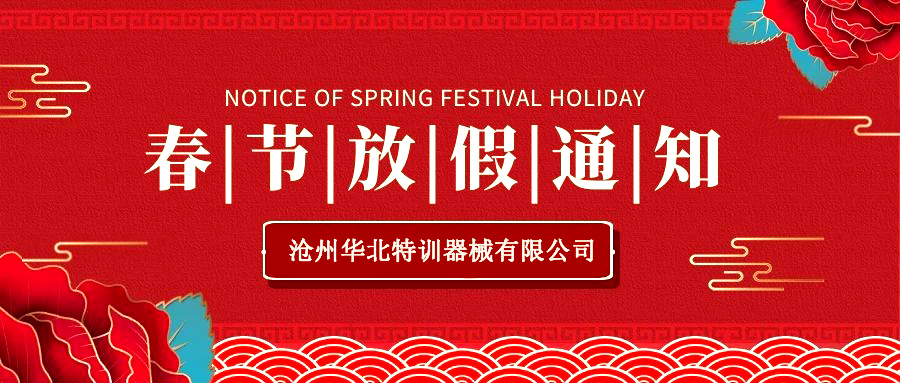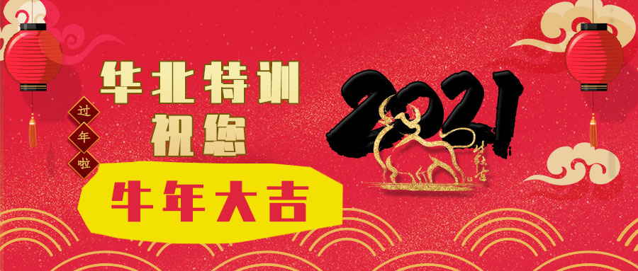 尊敬的新老客戶: 歲序更替,華章日新。華北特訓全體員工在此深深感謝大家長期以來對我司的支持與厚愛!向大家致以最誠摯的問候和最美好的祝福! 結(jié)合我司的實際狀況,公司春節(jié)放假時間具體安排如下: 春節(jié)放假時間:2021年02月03日——2021年02月18日(農(nóng)歷正月初七)。2月19日(農(nóng)...