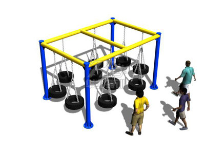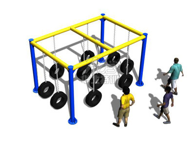 參訓(xùn)人員腳踩輪胎,手借助吊繩,通過慣性移動到另一個輪胎上,到達終點。
