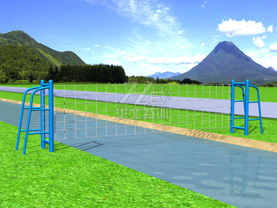 從橋的一端,雙手抓網(wǎng)、腳踩鋼絲,沿網(wǎng)到達(dá)另一端