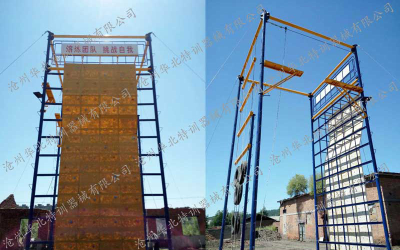 空四面體組合、攀巖(40塊)、單杠、斷橋、天梯4個項目,四米墻、背摔、電網(wǎng)、單人浪木、搭板過橋、安全裝備。