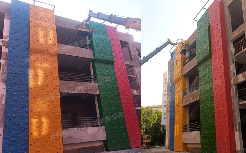 此類攀巖墻采用玻璃鋼樹脂復(fù)合材料制成,不含任何對人體有害的化學(xué)成分,每塊巖板0.9×0.9米,由各種不同造型的攀巖板拼接成造型豐富的整體墻面。攀巖板顏色可根據(jù)客戶需求定制。