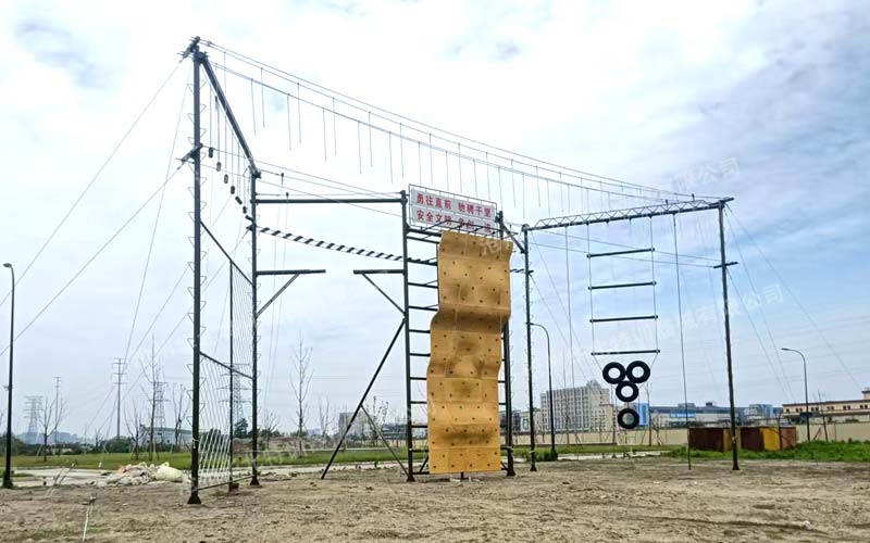 此款高空心理行為訓(xùn)練器械是經(jīng)典訓(xùn)練組合M1型,規(guī)格:39.32米×19.86米×12米(高),主要項目包含:攀巖、單杠、斷橋、天梯(速滑、速降)、蕩木橋、繩網(wǎng)、吊索橋、相互依存、叢林繩11個項目。