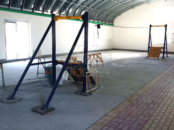 參訓(xùn)人員(可供一人)在有梯子的一端上去,站在花紋板上,借助鋼管利用慣性滑至另一端(可計(jì)時)