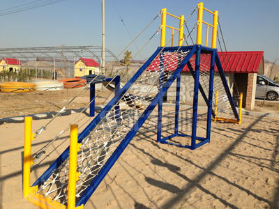 參訓人員由一端斜網攀爬至平臺然后由另一端輪胎坡爬下